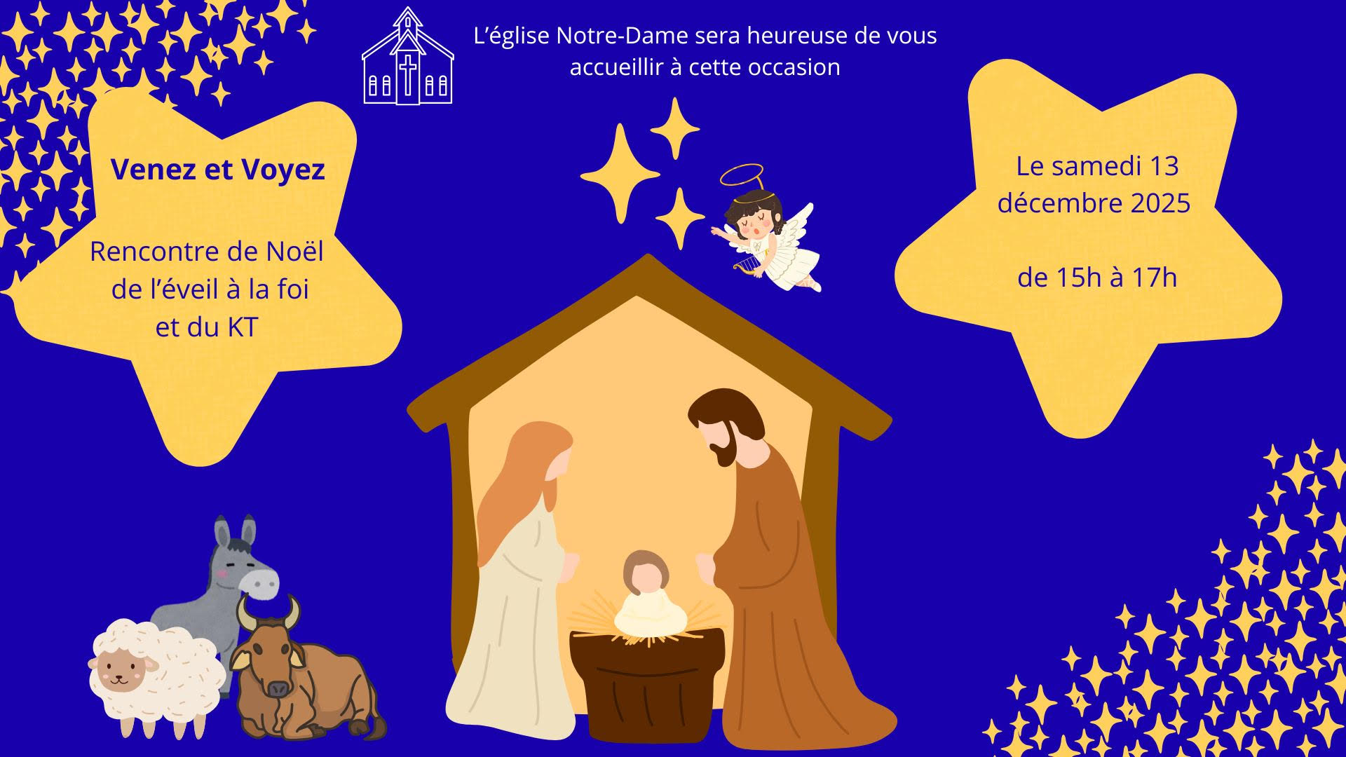 Nous vous donnons rendez-vous pour la rencontre de Noël de l'éveil à la foi et du KT, le samedi 13 décembre à l'église Notre Dame.