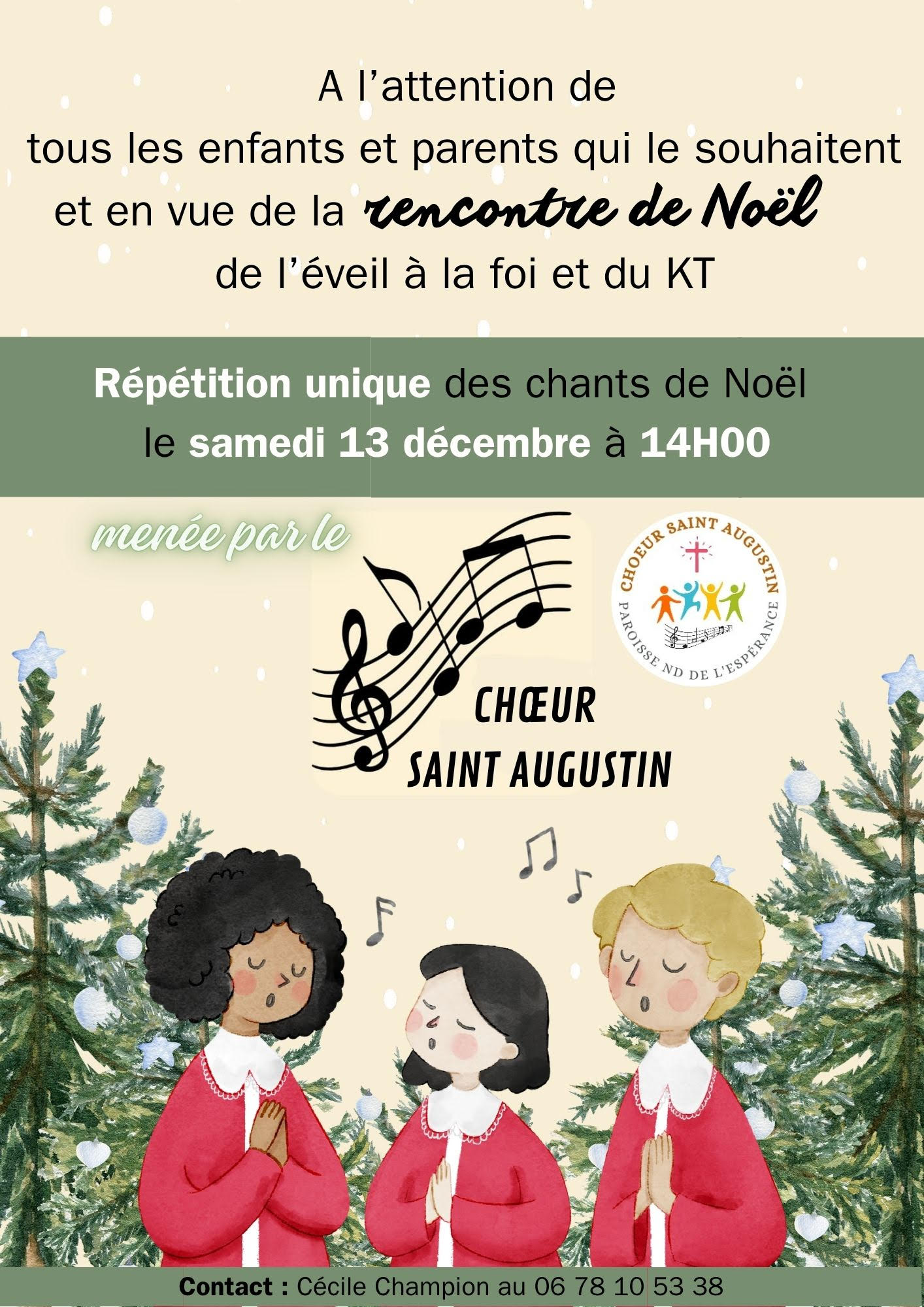 Le chœur st Augustin de la paroisse participera à la crèche vivante en proposant un répertoire de chants de Noël traditionnels et connus, permettant à chacun d'y prendre part si le cœur vous en dit. Une répétition unique est prévue pour les enfants et parents qui le souhaitent, le samedi 13 décembre à 14h.